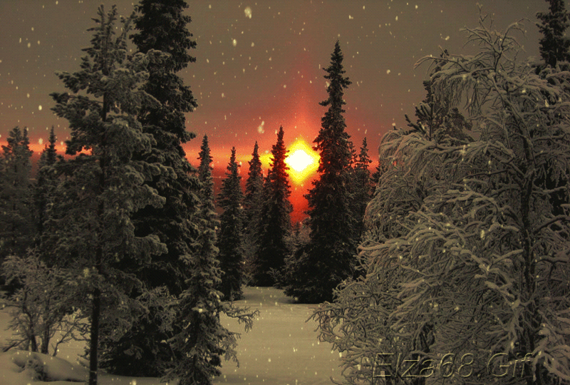 7. Анимированная открытка зимний лес вечером во время снегопада