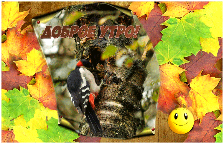 3. Прикольная гифка с дятлом и пожеланием доброго утра в осенним стиле!