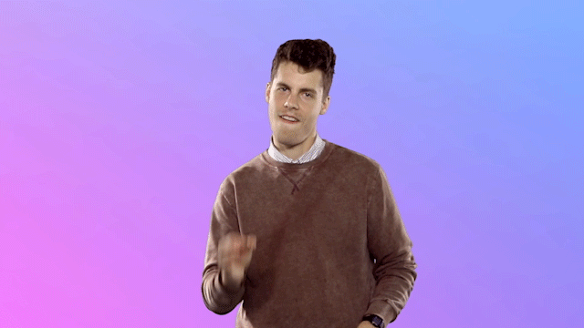 5. Гиф картинка Уверенный в себе парень показывает Ок, стоя на красивом фиолетово-голубом фоне