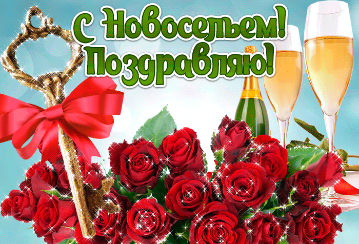 Новая мерцающая gif картинка с новосельем и с шампанским.