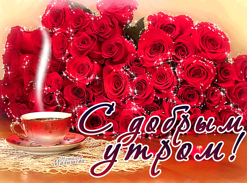 10. Картинка с букетом мерцающих роз и надписью с добрым утром!