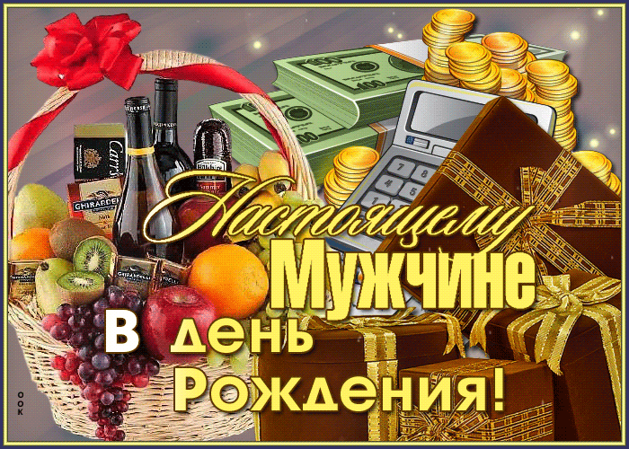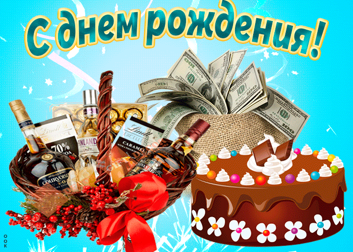 7. Блестящая анимированная открытка с днем рождения мужчине с подарками, коньяком, деньгами и цветами!