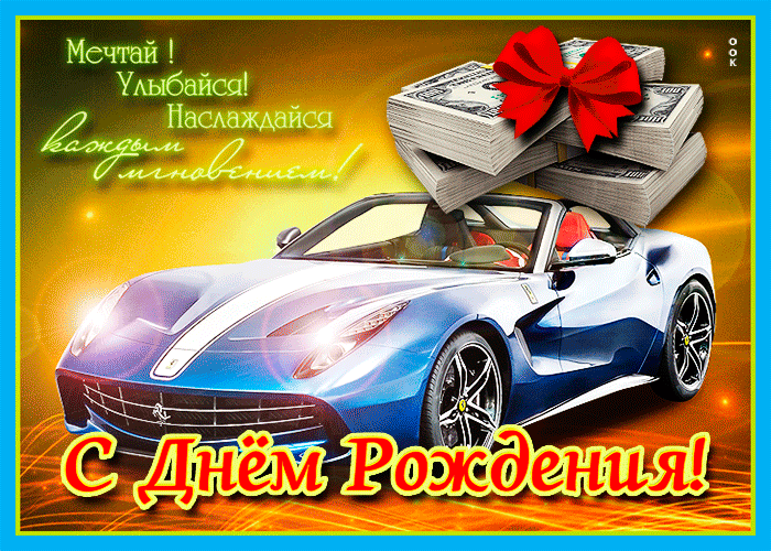 8. Прикольная анимационная открытка с днем рождения мужчине с деньгами и крутой тачкой