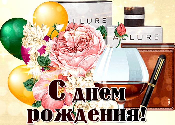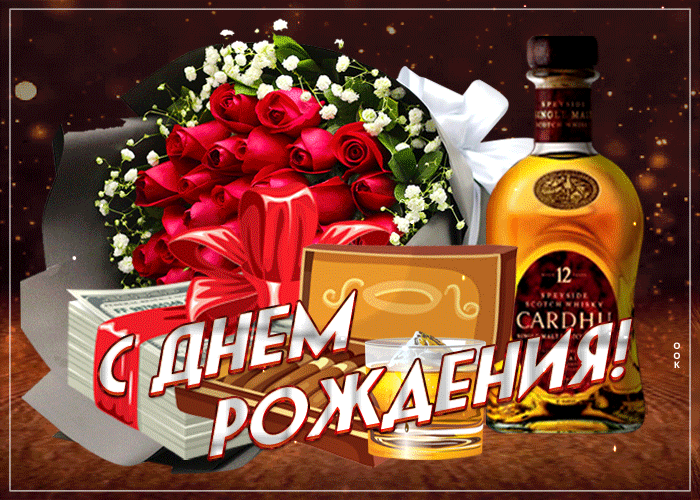 11. Лучшая мерцающая гиф открытка с днем рождения мужчине с коньяком и розами