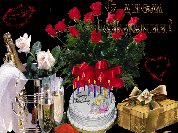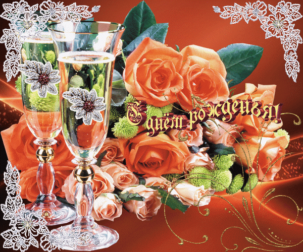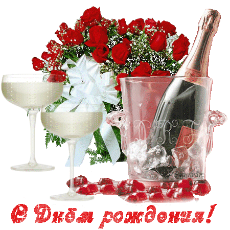 14. Блестящая гифка с днем рождения для женщины с цветами и шампанским!