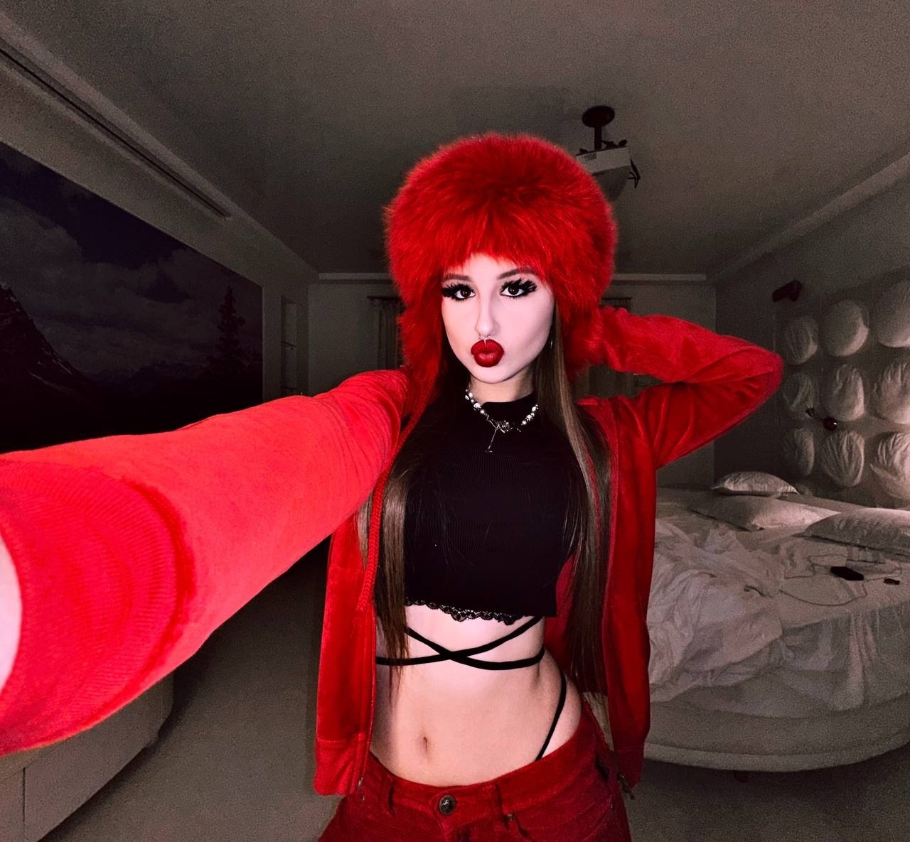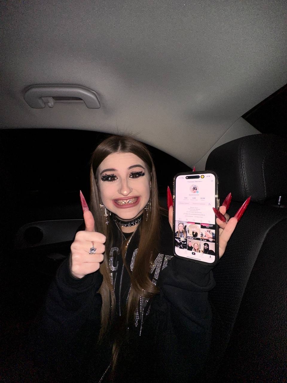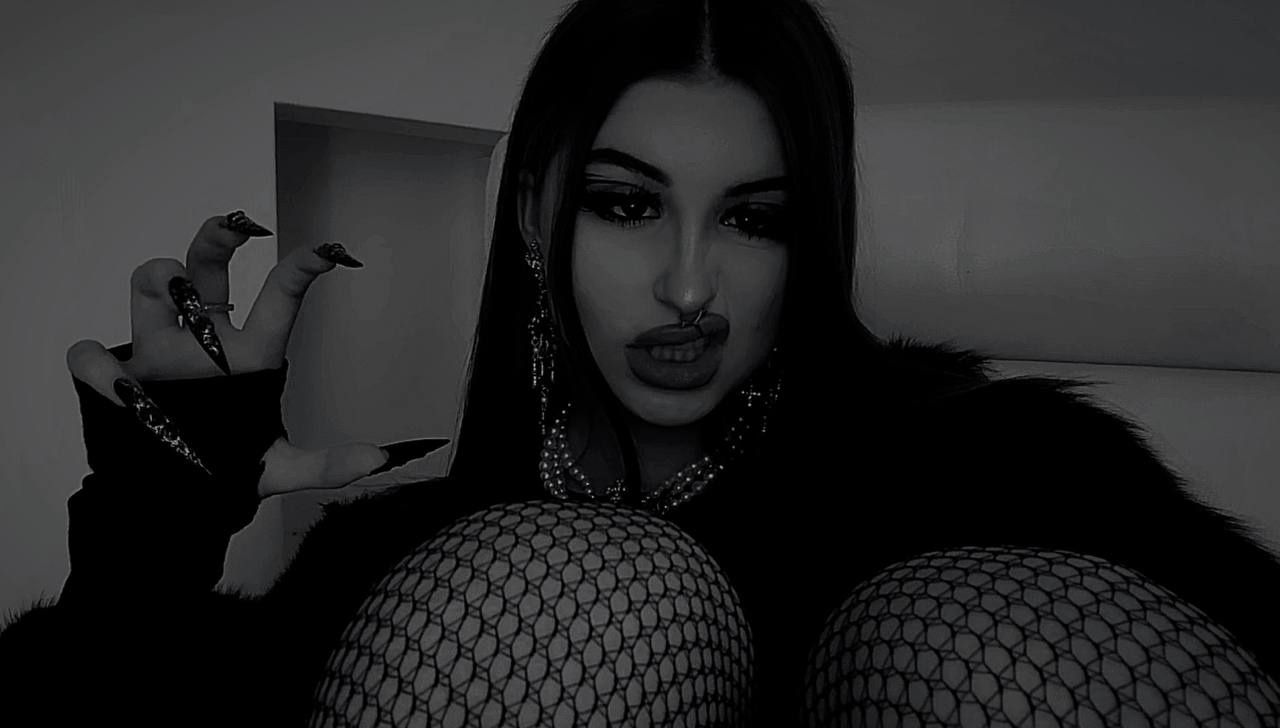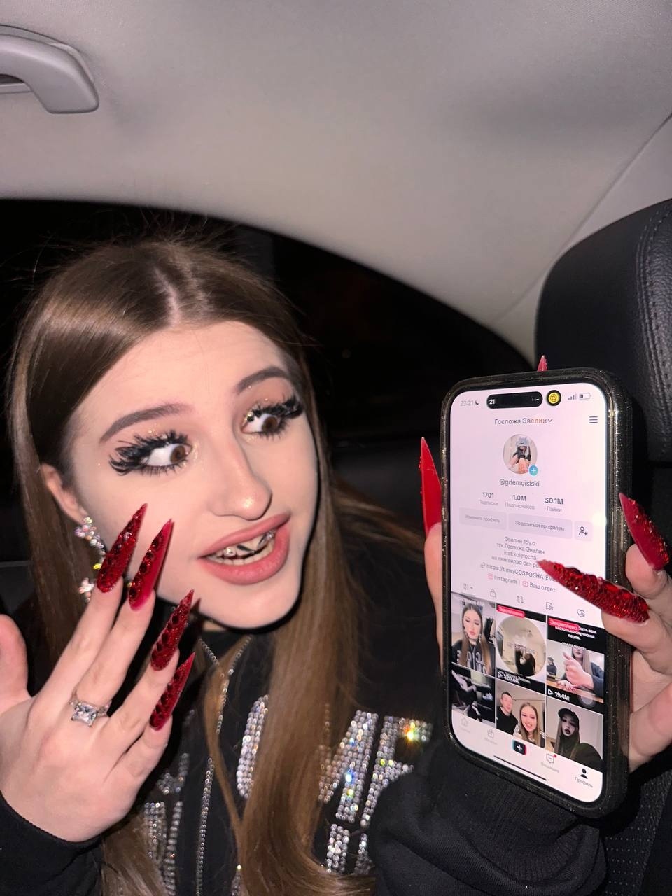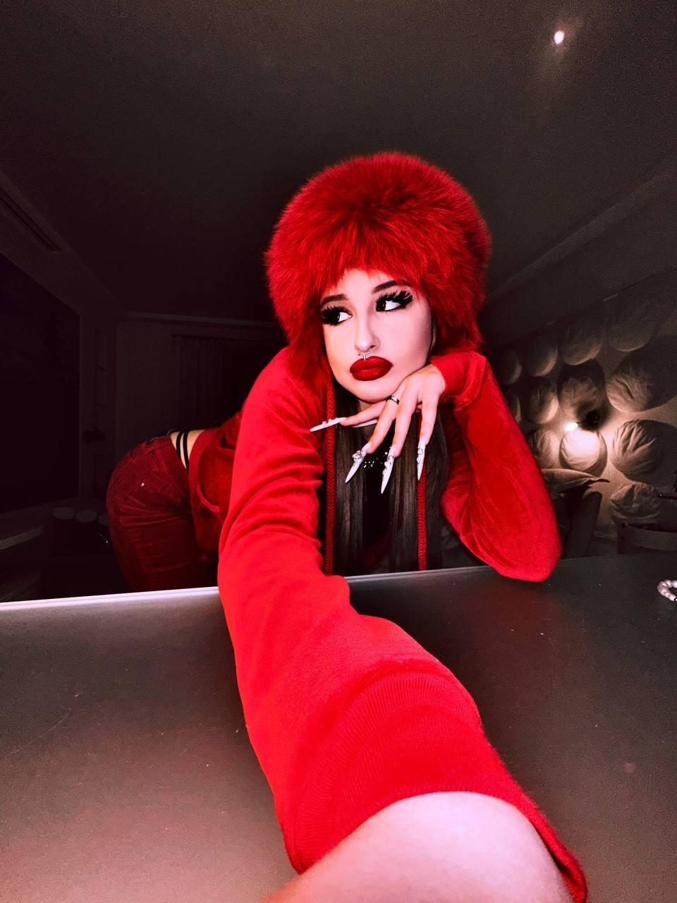 Крутой снимок Эвелин с высунутым языком и огромными красными ногтями в чёрном кожаном платье.